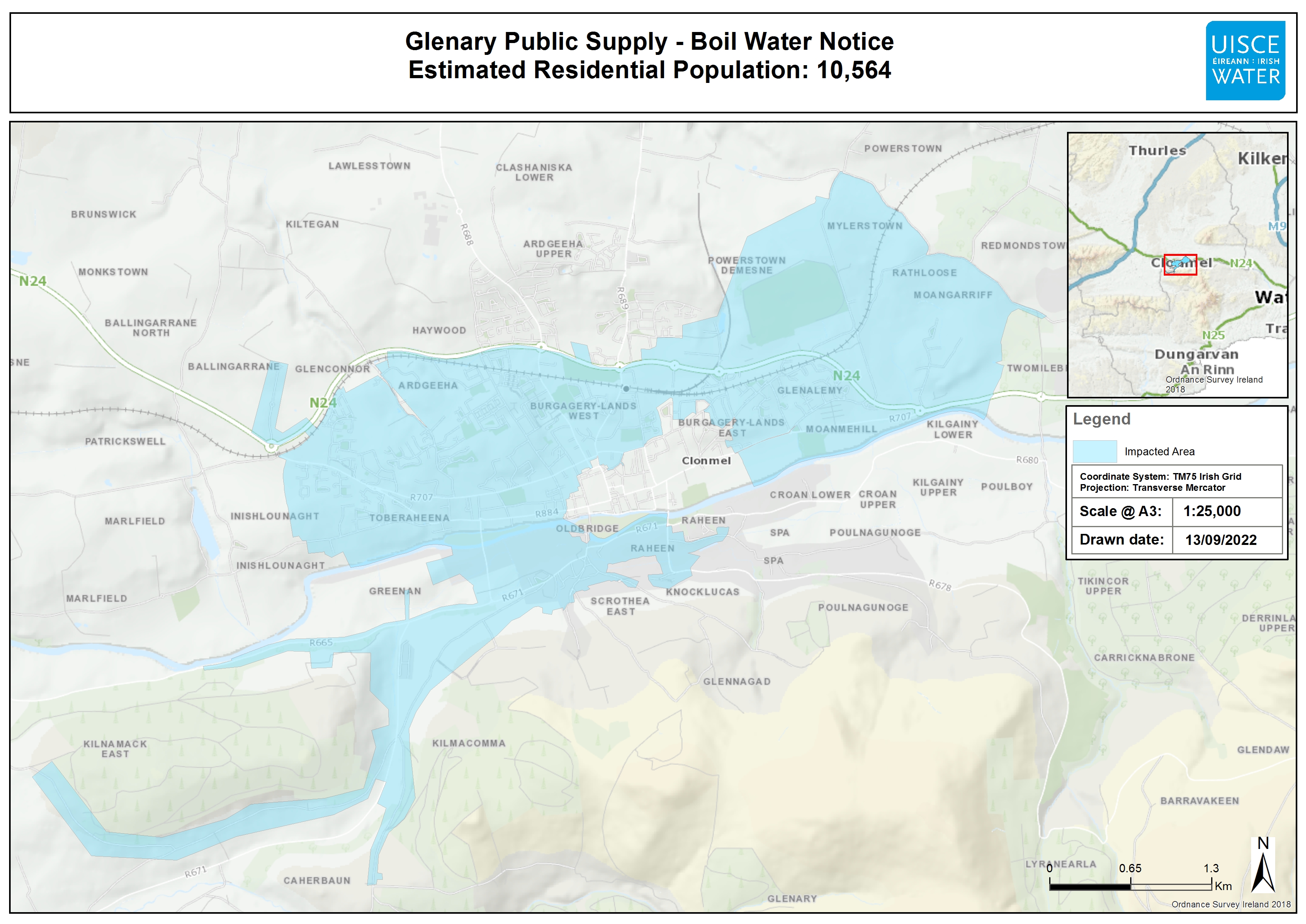 The notice, issued due to elevated turbidity in the supply which has affected treatment, has been put in place to protect the health of approximately 10,500 customers on the public supply serving parts of Clonmel Town centre and surrounding areas, including Cashel Road, Cahir Road and Ring Road. A map of the area affected by the Boil Water Notice is attached.