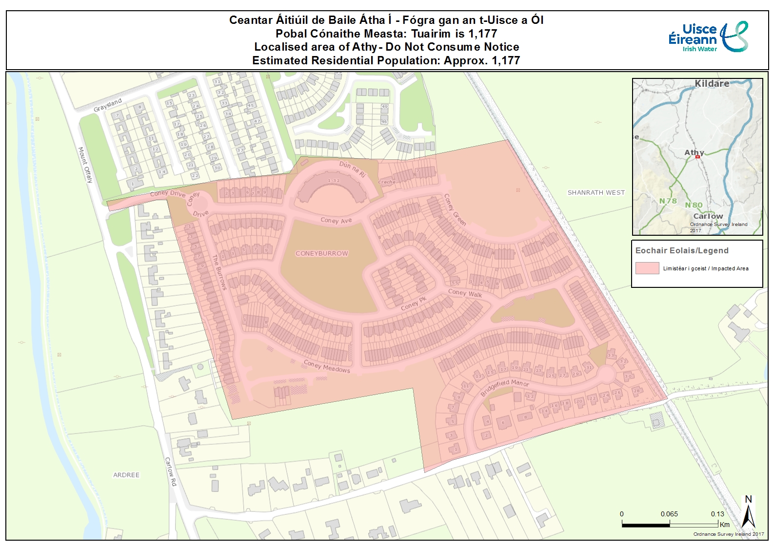 Following consultation with the Health Service Executive (HSE), Uisce Éireann, working in partnership with Kildare County Council has issued a Do Not Consume Notice for all consumers in Bridgefield Manor and Coneyburrow in Athy, due to elevated levels of aluminium and manganese detected in the network. The notice applies to approximately 1,177 customers supplied by the Barrow Water Supply Zone.